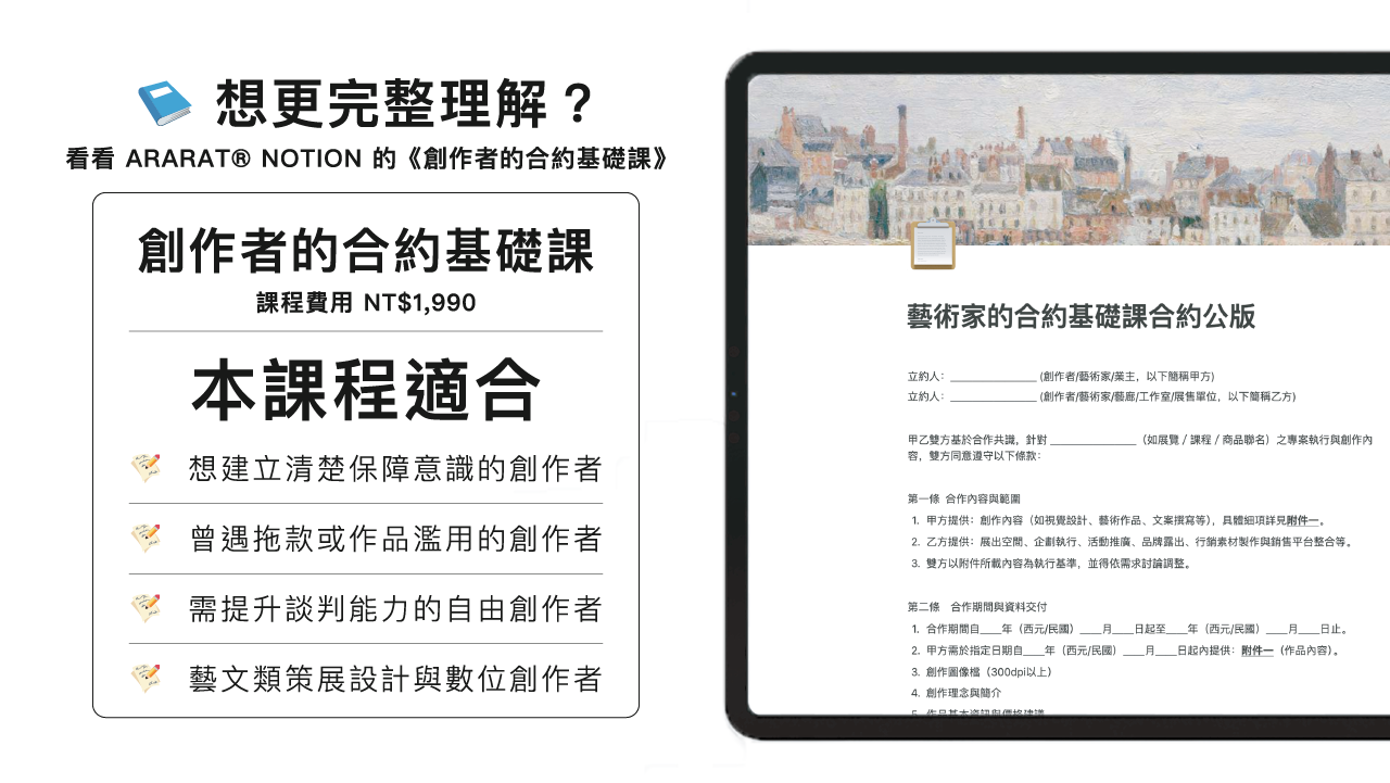 這是一堂為自由接案的藝術家、插畫家、設計師與藝文工作者所設計的Notion課程筆記模型,透過詳細的整理,把複雜的合約知識變成簡單易懂的架構,不只是學習,更是一份可以直接使用的工具,幫助創作者了解常見合約陷阱、智慧財產權重點、實務應用,帶你看懂合約語言、辨識高風險條款,並把「口頭共識」化為可執行的書面合約。
